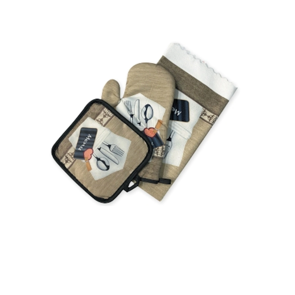 Σετ γάντι, πιάστρα και ποδιά κουζίνας. Όλα φέρουν ίδιο σχέδιο. Η σύνθεσή τους είναι 100% πολυεστέρας. Το γάντι και η πιάστρα διαθέτουν θηλάκι για να τα κρεμάτε και ρέλι σε μαύρο χρώμα. Εσωτερικά έχουν πολυεστερική βάτα για να αποφεύγονται τα ανεπιθύμητα καψίματα κατά το μαγείρεμα. …