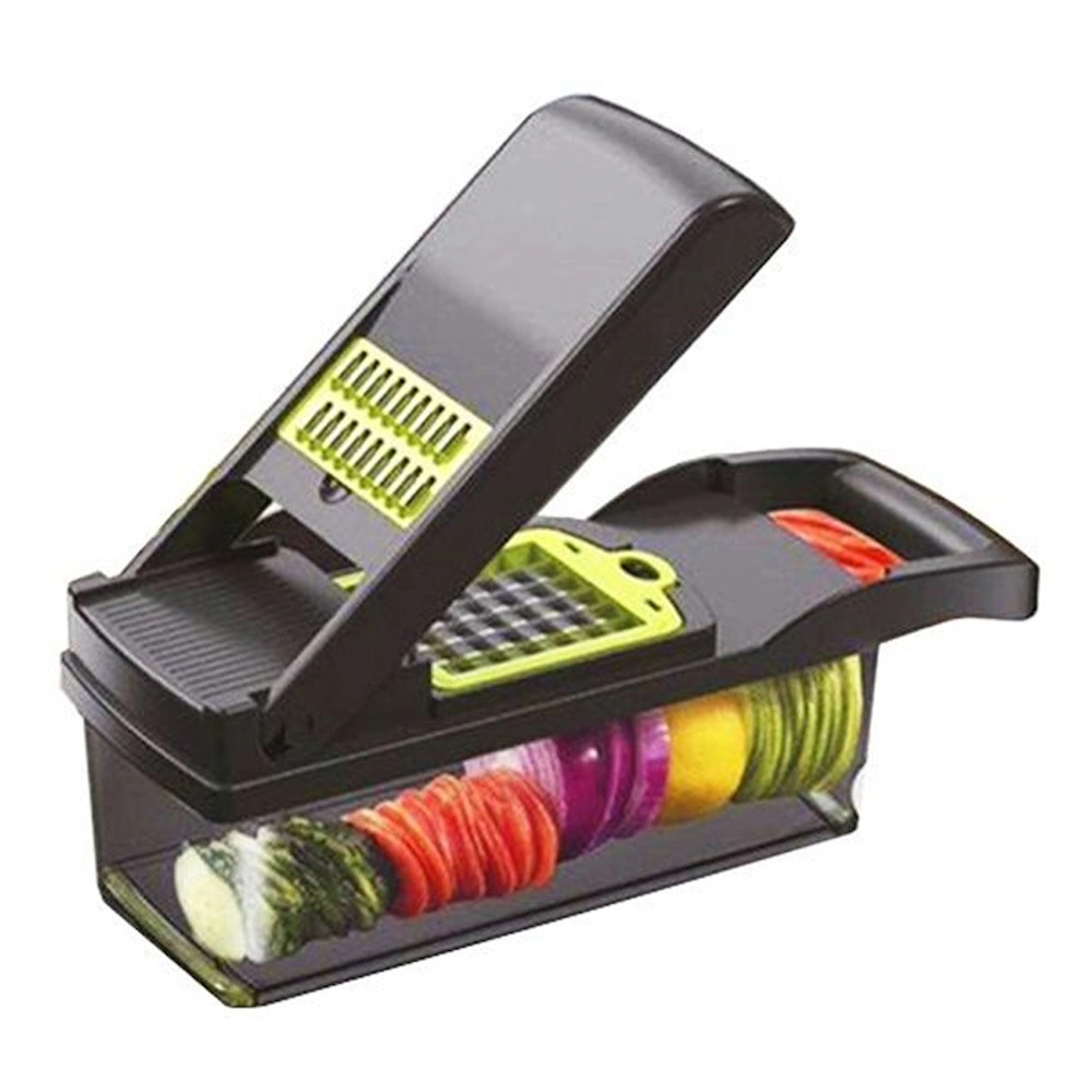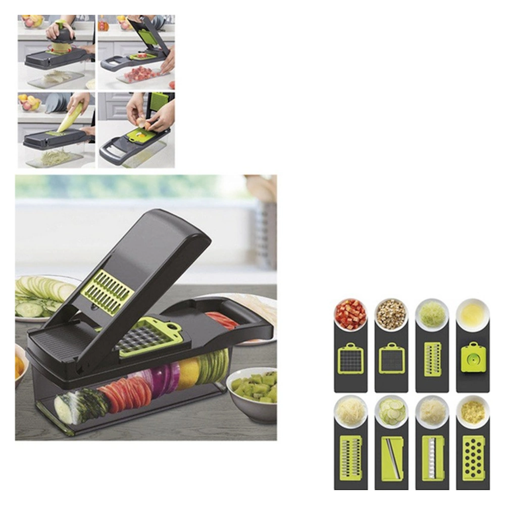 Πολυκόπτης λαχανικών με δοχείο χωρητικότητας 1,2l και πλήρες σετ εξαρτημάτων. Διαθέτει εναλλάξιμες λεπίδες από ανοξείδωτο ατσάλι και είναι ιδανικό για να τεμαχίσετε, να κόψετε, να ψιλοκόψετε και να τρίψετε λαχανικά, γλιτώνοντας χρόνο και κόπο. Είναι εύκολο στο καθάρισμα και ασφαλές για πλύση στο πλυντήριο πιάτων.